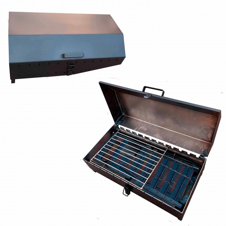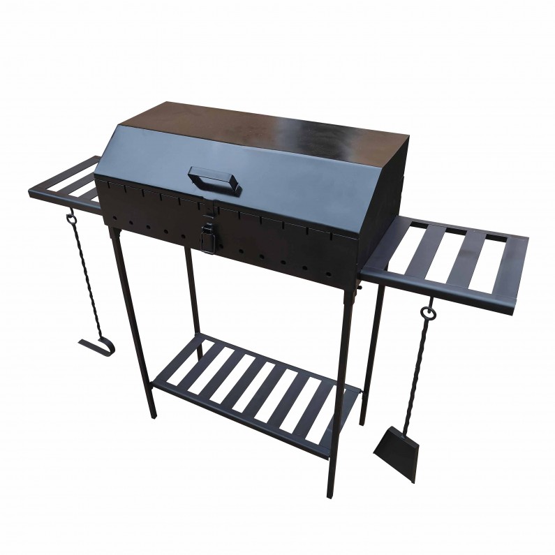 Міцна жаровня зі сталі товщиною 5 мм рівномірно розподіляє жар, добре тримає температуру і не деформується навіть при інтенсивному використанні. Завдяки кришці-барбекю ви можете готувати страви швидше та захищати їх від вітру, дощу та пилу.