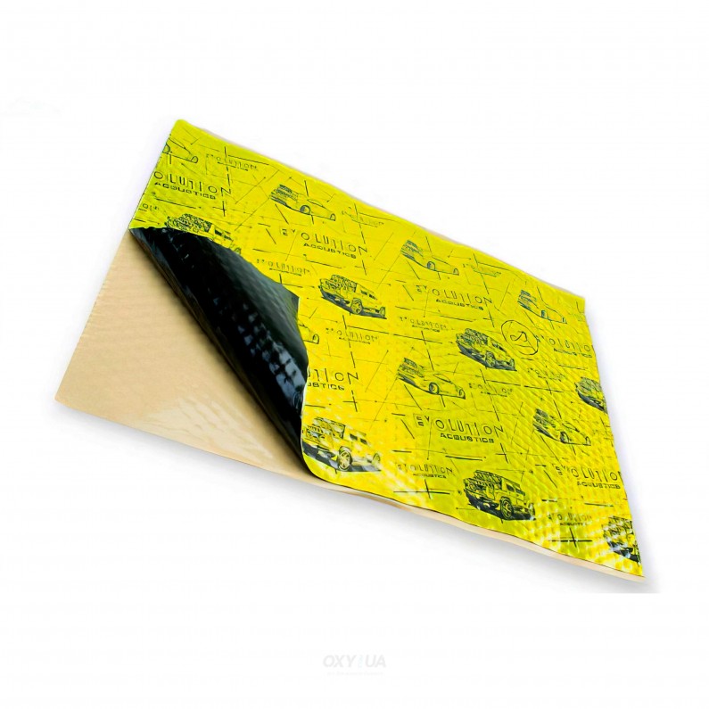 Акустікс Еволюшн — високоефективний вібродемпфуючий матеріал з покращеними молекулярними властивостями для максимального поглинання вібрації. Багатошарова структура включає бутиловий полімер на основі високомолекулярного поліізобутилену, каучукові компоненти та спеціальні модифікуючі добавки, які підвищують міцність та покращену адгезію до металу.